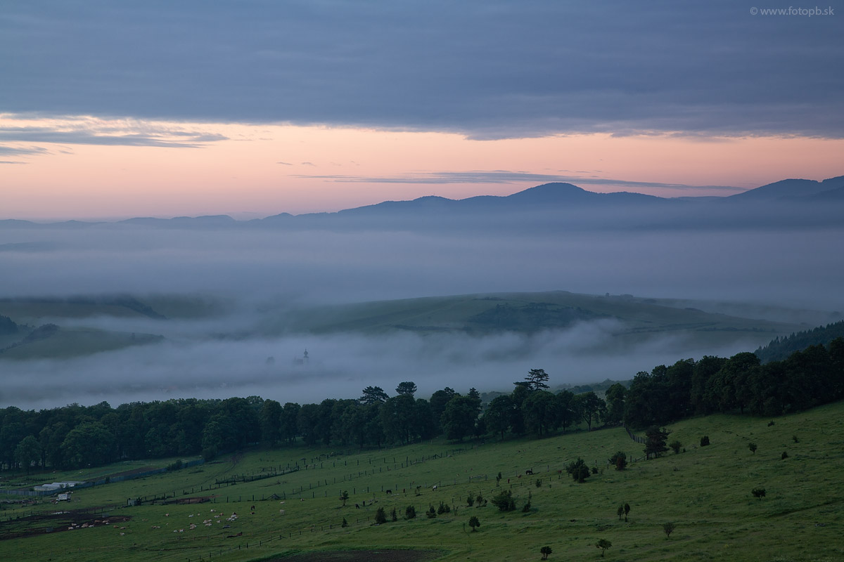Tesne pred východom slnka. V popredí sa začínajú pásť domáce zvieratá v obore pod Dreveníkom , ktorých je tam neúrekom.