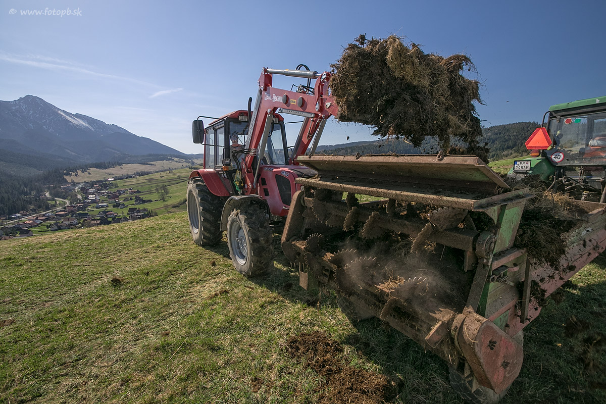 Nakladanie maštaľného hnoja pred jeho rozmetaním na pole, kde miestni pestovatelia budú onedlho sadiť zemiaky.