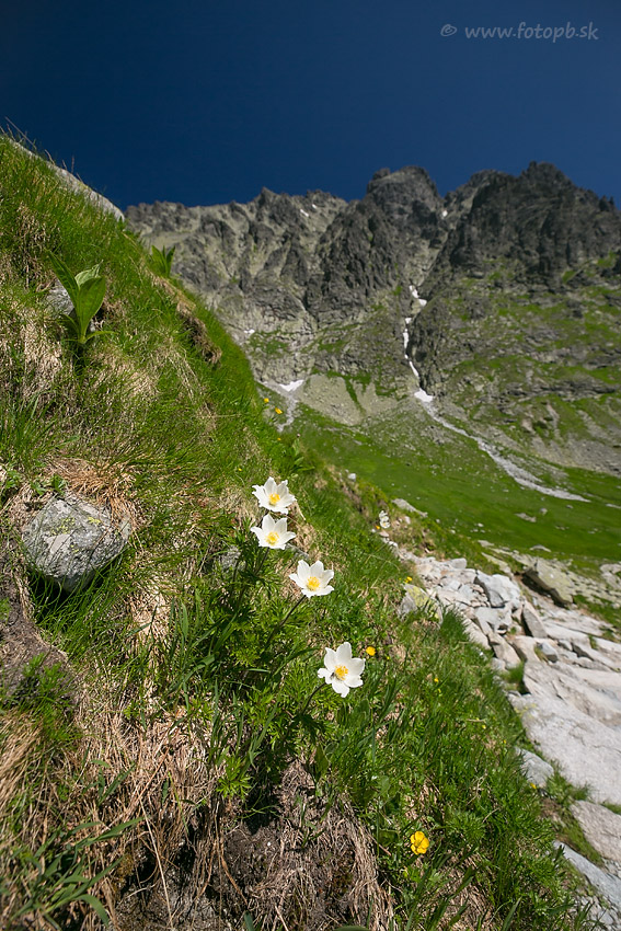 Z týchto pekne usporiadaných poniklecov a pozadia sa dali urobiť fakt efektné fotografie, ale silný vietor nimi hýbal hore-dole, čo veľmi sťažovalo komponovanie a tak som urobil len zopár záberov s krátkym časom v okamihu keď trochu menej fúkalo. Škoda, lebo práve kvôli fotografovani tatranských kvetov s pozadím som tam išiel a stálo ma to veľmi veľa energie.