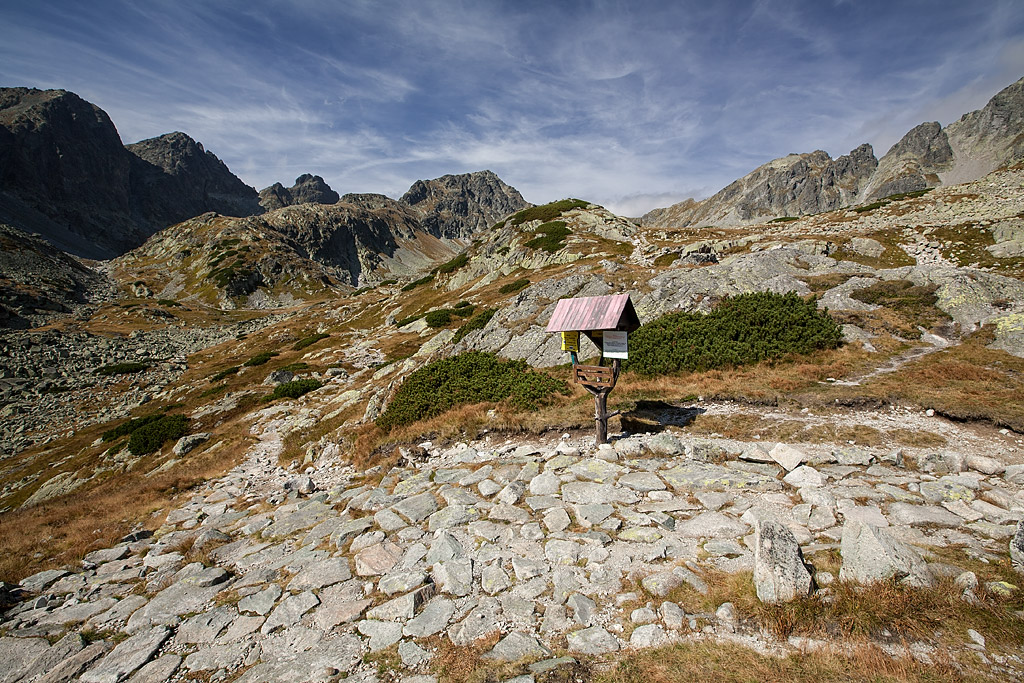 Rázcestník vo Veľkej studenej doline. Jedna cesta vedie k Teryho chate, druhá na Sliezsky dom.