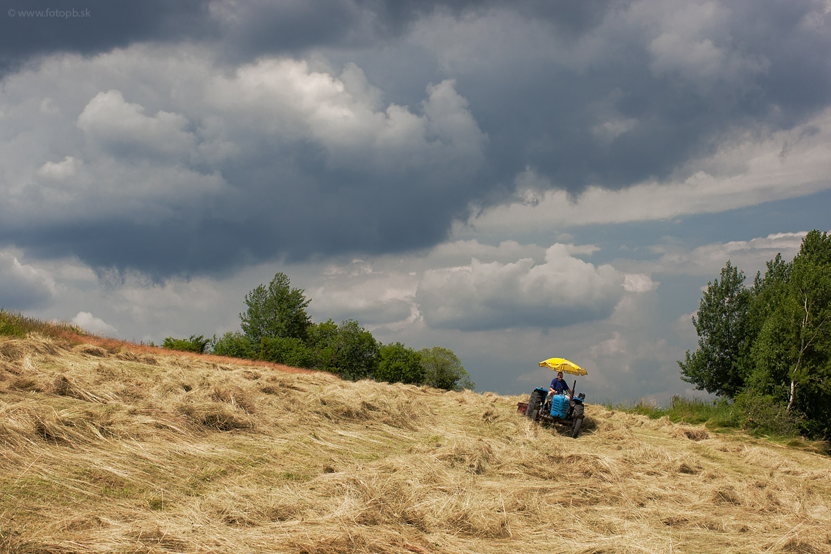 Zhrabovanie sena s pomocou Zetora s originálnou letnou strechou.