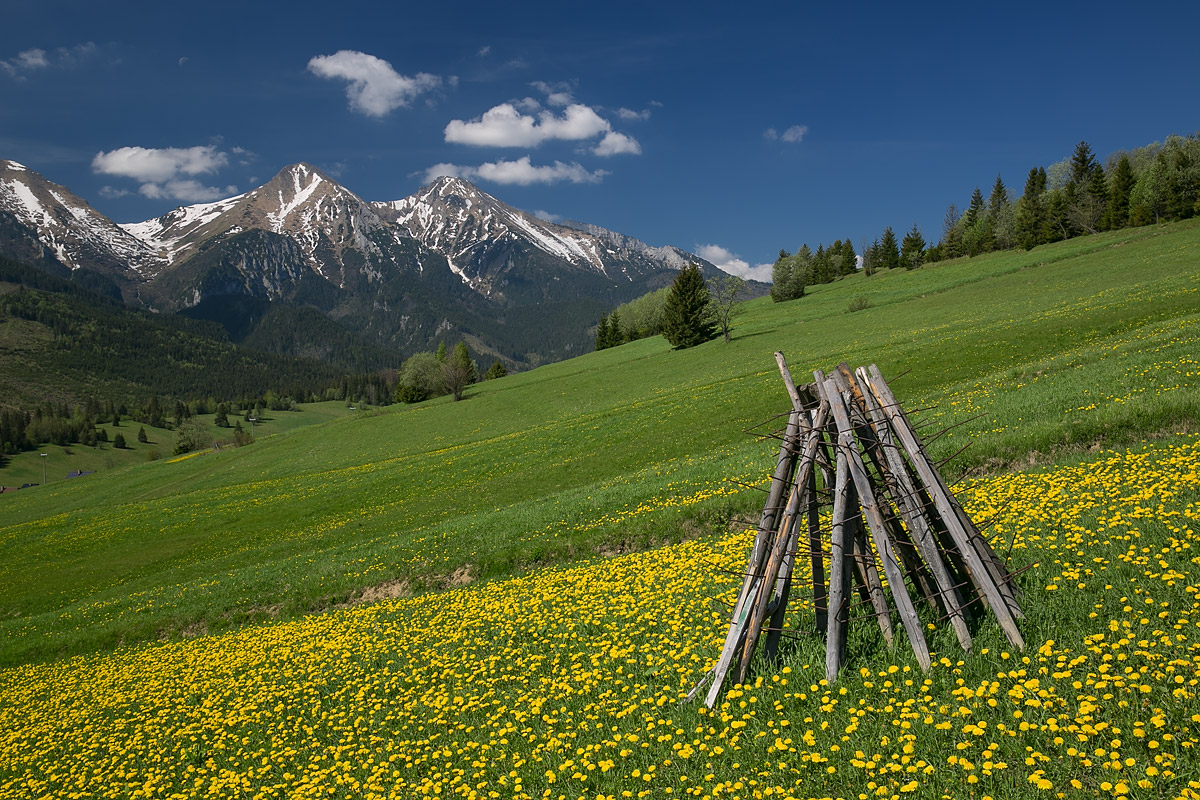 V druhej polovici mája doplňujú kvitnúce púpavy v Ždiari prekrásny pohľad na Belianske Tatry. Ak vyjde aj "pohľadnicové počasie" tak je radosť fotografovať. Čerstvý, no nie chladný vietor na fotografii nevidno, ale popoludní sa už statív nedal na niektorých miestach použiť kvôli vibráciam. Snáď len alergikom na peľ návštevu nedoporučujem, lebo ho poletuje všade okolo toľko, že každých niekoľko minút treba oprašovať polarizačný filter.