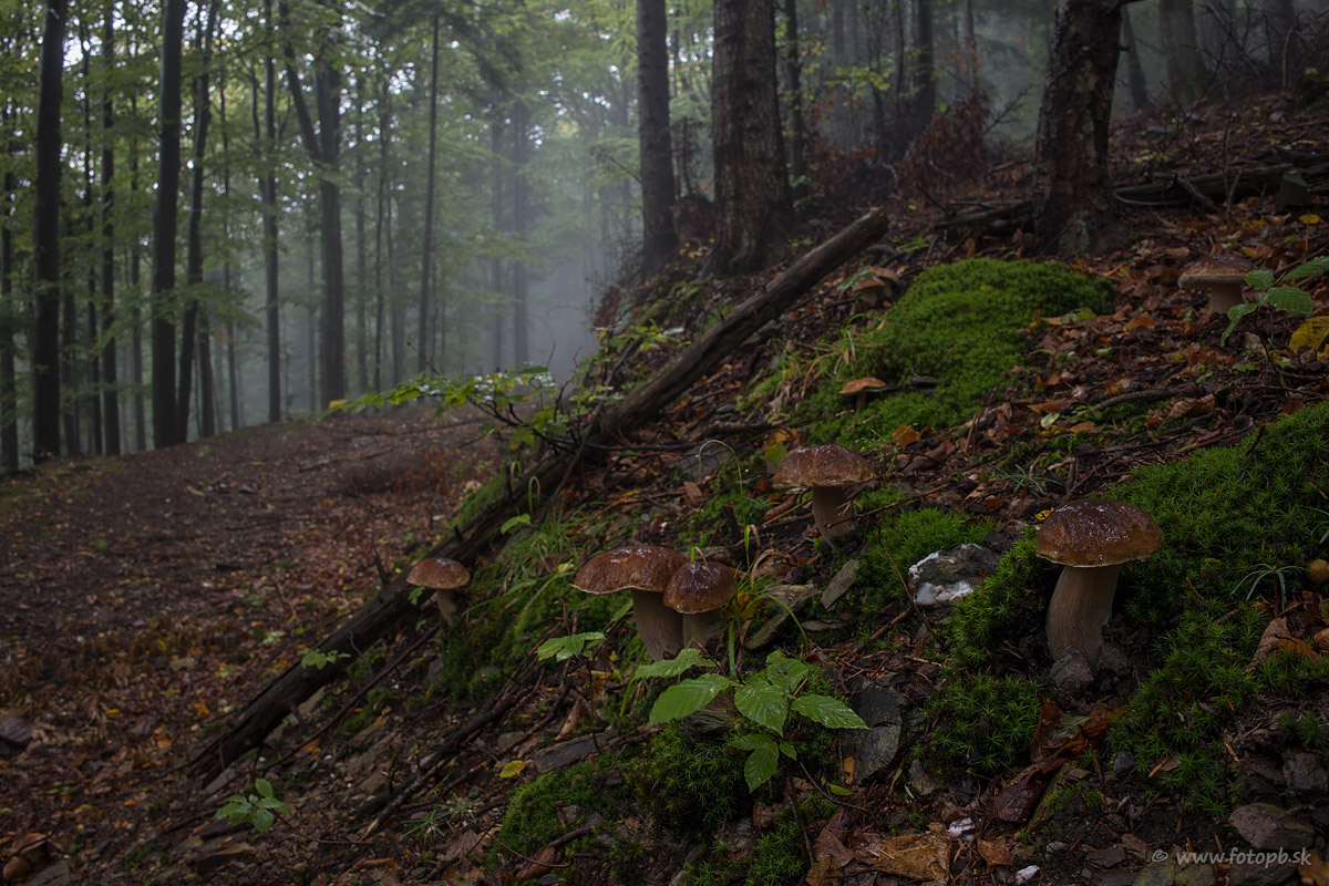 Na fotografii je 12 hríbov a jeden suchohríb. Aj úplne v ľavom dolnom rohu sú dva. Takto vyzerá celá veľká časť lesa pod hrebeňmi Volovských vrchov. Často ich je na rovnakej malej ploche ešte viac. Zbieral som len jeden košík malých hríbov na nakladanie, no aj napriek tomu že ich rastú tisíce to nebolo jednoduché, lebo po daždi bolo veľmi mokro, malé sa ťažšie vyberajú a mnohé aj z tých najmenších boli dosť červavé. Komplikovalo mi to fotografovanie, ktoré vyžaduje čas a tak som sa rozhodol, že ak tam v nedeľu 27.9.2025 zájdem, budem hríby iba fotografovať a len ak v okolí cesty dole niečo nájdem, naložím cca polovicu menšej tašky, ktorú zatiaľ môžem niesť v batohu. Potrebujem mať jednu voľnú ruku keďže palica v druhej je nevyhnutná a namiesto košíka v nej môžem fotoaparát s mini statívom, čo mi značne uľahčí prácu, lebo nemusím techniku neustále vykladať z batohu a montovať. Na miesta kde rastú som išiel 26.9.2025 v daždi, potom síce na niekoľko hodín prestalo pršať, ale keď som sa vracal dole tak opäť začalo a to dosť silno. Cesta dole s plným košíkom malých hríbov je ešte náročnejšia pretože sa šmýka a košík je oveľa ťažší ako bežne, lebo malé huby ho viac vyplnia a ešte ktomu boli nasiaknuté vodou. Keby niekto kto vie z akej diľaky huby nosím videl ako vyzerám a vedel v akom som mizernom zdravotnom stave, tak by mi neveril že som to zvládol. Sila vôle je veľká.