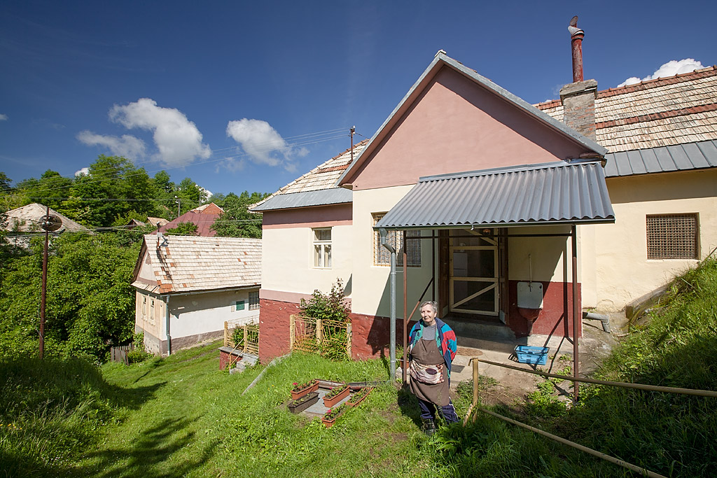 Jej dom v pozadí je typickou architektúrou Poproča nad Hnúšťou. Patrí k tým najudržiavanejším domom, v ktorých žijú obyvatelia obce.