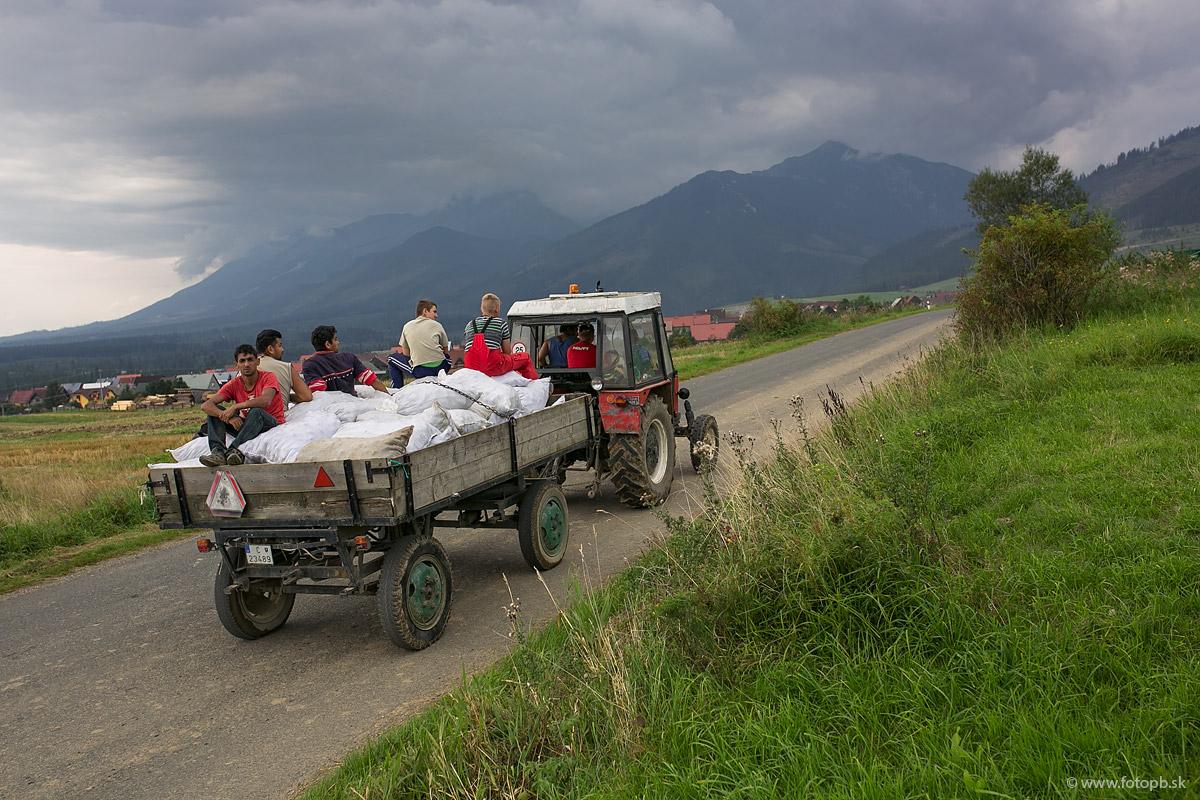 Gazdovia aj s pomocníkmi z neďalekej osady sa vracajú s úrodou zo zberu zemiakov.