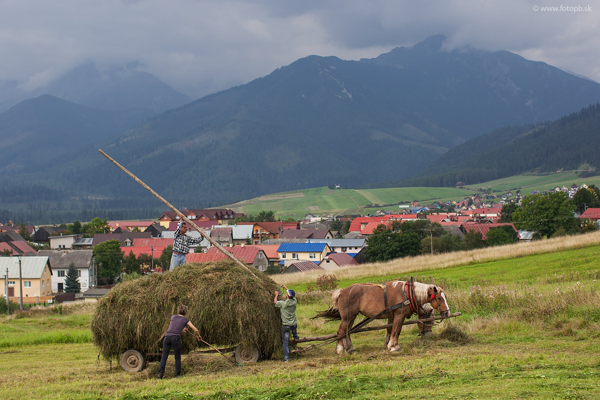 Seno naložené na voze sa musí zatlačiť pomocou drevenej tyče aby cestou nepadalo.