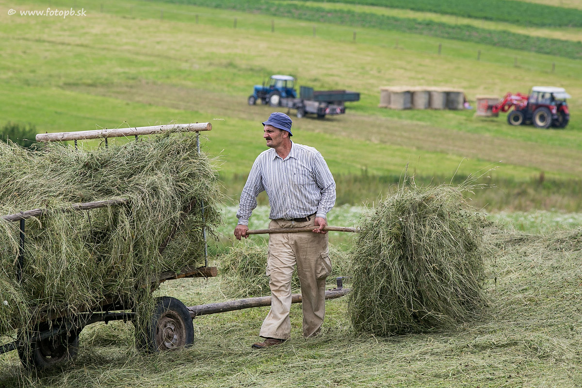 Už len niekoľko prevažne starších Závadčanov hospodári na miestnych poliach a lúkach tradičným spôsobom. Postupne sa aj do tejto oblasti dostáva strojová technika ako to vidno v pozadí na tejto fotografii. Myslím že sa mi na nej celkom slušne podarilo tento trend a kontrast zdokumentovať.