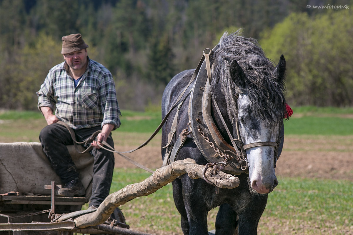 Miestny gazda zaúča mladého koníka ťahať povoz.