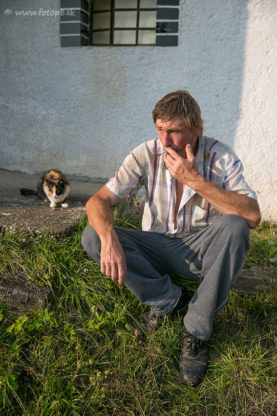Gazdov podvečerný oddych s cigaretkou po práci. Spoločnosť mu robila domáca mačka.