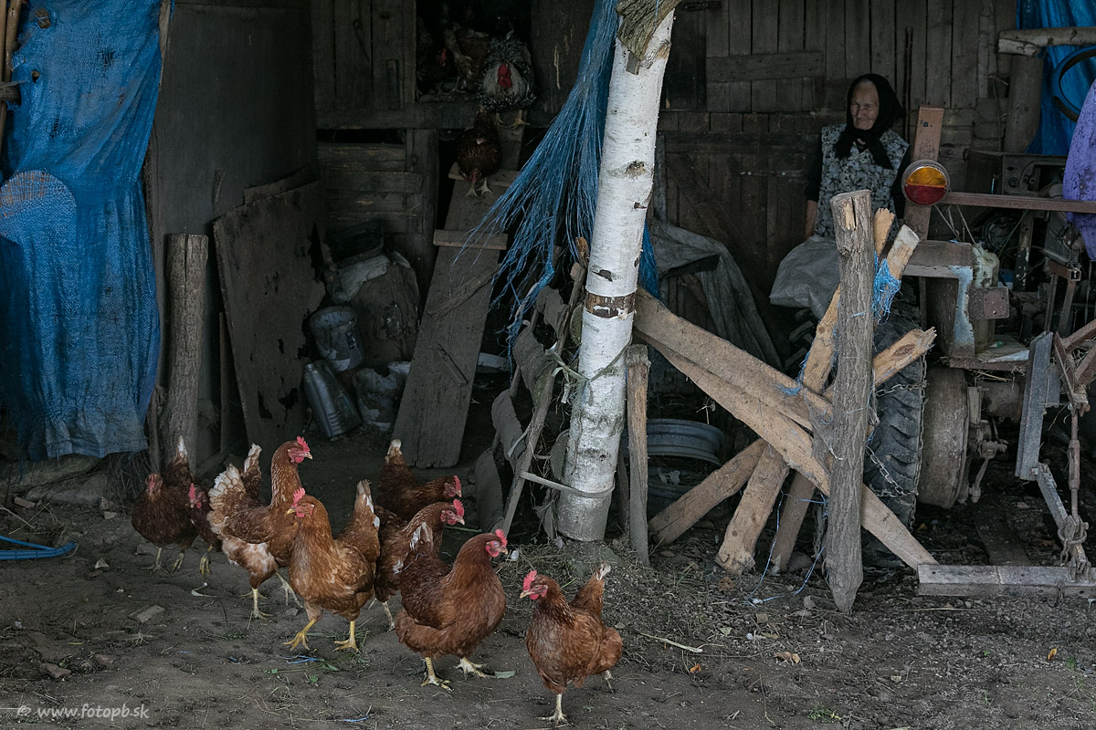 Babka práve vypustila sliepky a kohúta z kurína.