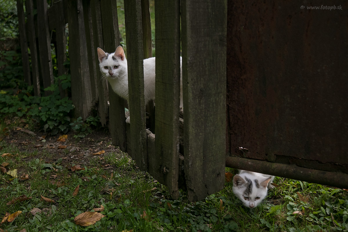 Po príchode na parkovisko do obce kam chodím občas na huby ma v jeseni 2022 stále vítajú tieto hravé mačiatka. V Lucia Bani je plno mačiek, tam sa musí chodiť autom veľmi opatrne, lebo bežne vylihujú na vozovke , alebo ju prebiehajú z jednej strany na druhú. Týmto dvom som musel trpezivo skoro štvrť hodinu vysvetľovať pri odchode aby sa mi nemotali okolo auta, lebo sa za kolesami hrali na skrývačku.