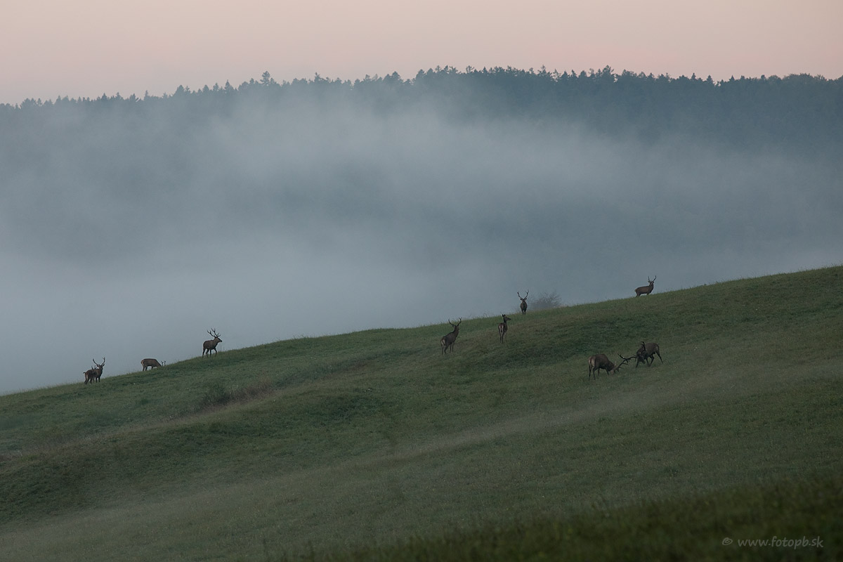 Na fotografii je 9 jeleňov z toho dvaja sa bijú.