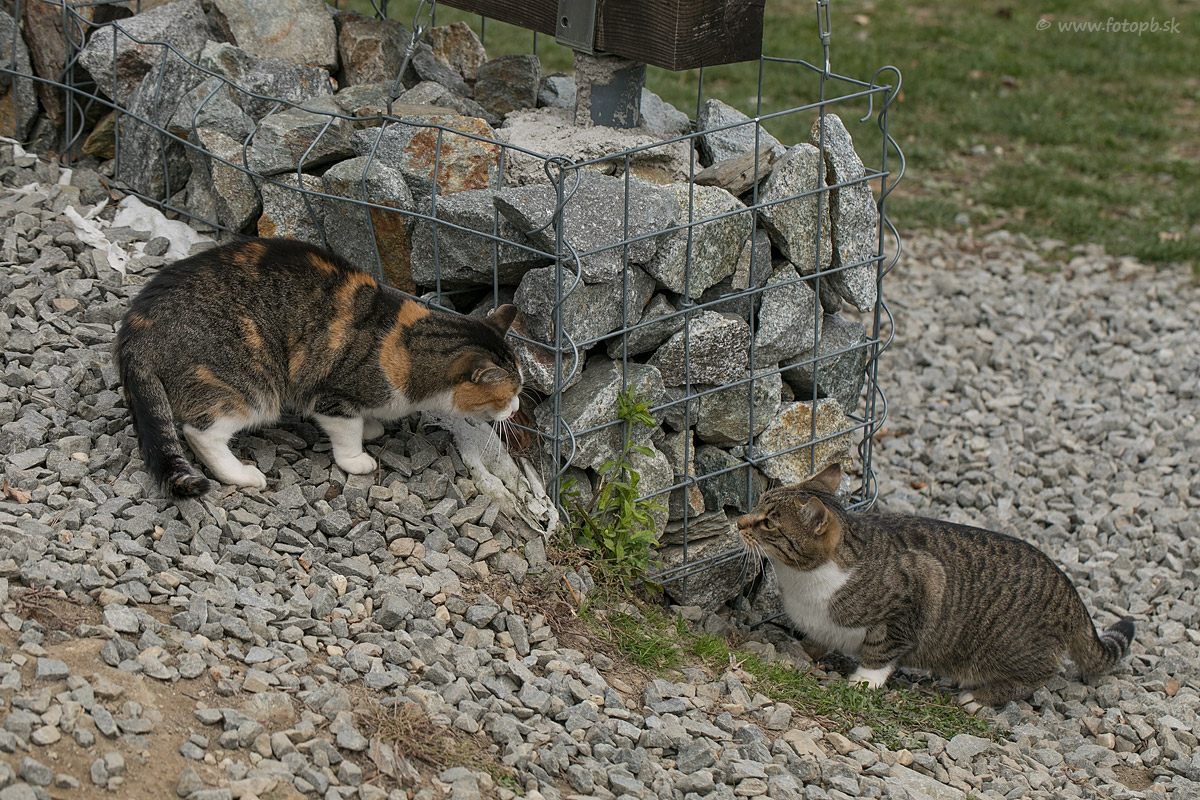 Pri chate na Hrešnej pribudla nová mačka. Tá vľavo je súčasťou okolia už veľa rokov, je mimoriadne prítulná a vôbec sa nebojí ľudí. Skoro vždy keď prídem k chate v čase kedy je tam veľmi málo turistov, alebo okrem mňa vôbec nikto, pribehne ku mne, vyskočí na kolená a pokojne si sedí. Raz dokonca na mne aj zaspala. Podľa toho ako na seba mačky zazerali, ešte nie sú celkom kamaráti a zdalo sa mi, že staršia trojfarebná sa tygrovanej mačky trochu bojí.