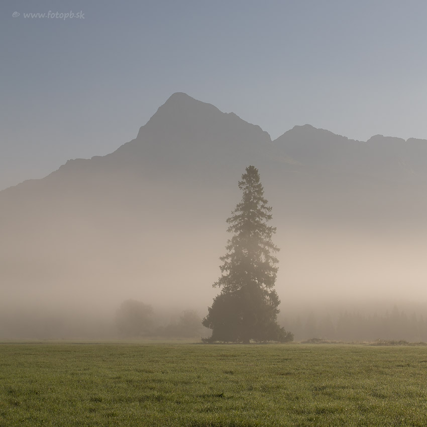 Z tohto miesta som vždy fotografoval dreveničku, ktorá je pod smrekmi vľavo mimo záberu, ale pred rokom tam natáčali rozprávku, pristavili pred dreveničkou niečo ako verandu a teraz ostala prikrytá plachtou, takže sa nedá fotografovať. Je to veľká škoda, lebo išlo atraktívnu scénu s dominantným Kriváňom v pozadí, ktorá mala veľký potenciál v každom ročnom období.