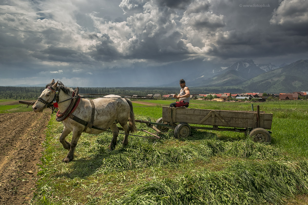 Gazda má naponáhlo. Od Tatier sa k Lendaku rýchlo blíži poriadna jarná búrka a ostáva mu len málo času aby pokosenú trávu pozhraboval a naložil na voz. Kobylka aj napriek tomu, že čo nevidieť sa jej narodí žriebä na slovo poslúchala a nezdržiavala ho pri práci.