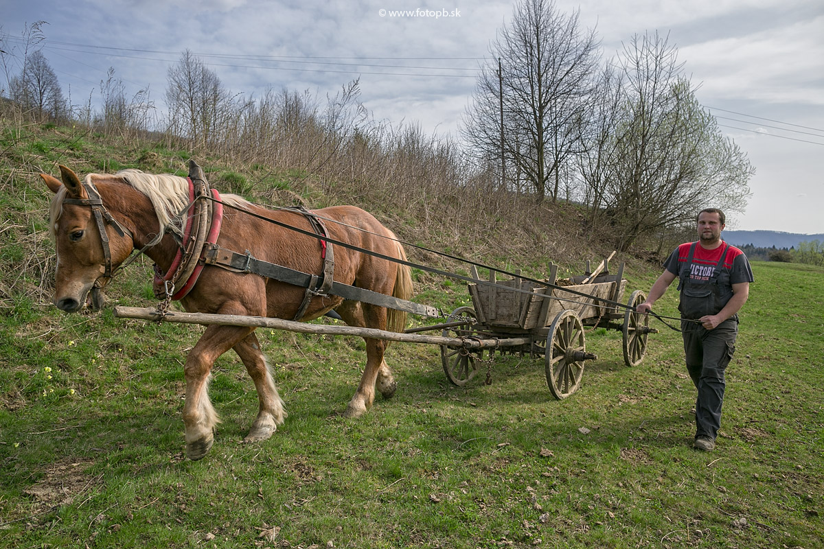 Poľné a lesné cesty nad Muránskou Zdychavou sú strmé, často aj poriadne vymyté od lejakov a plné blata po topiacom sa jarnom snehu. Na prevoz maštaľného hnoja je preto najlepším dopravným prostriedkom konský záprah s vozom, ktorý má klasické veľké drevené kolesá.