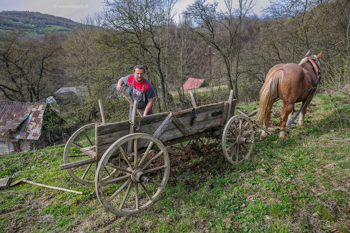 A to už je posledná fáza prípravy pôdy na dobrú úrodu. Ručné rozhadzovanie maštaľného hnoja na ťažko dostupné políčka nad Muránskou Zdychavou. Koník je dobre vycvičený, vie čo má robiť a poslušne čaká keď gazda s prácou skončí aby odľahčený voz odtiahol späť na dvor do dediny.
