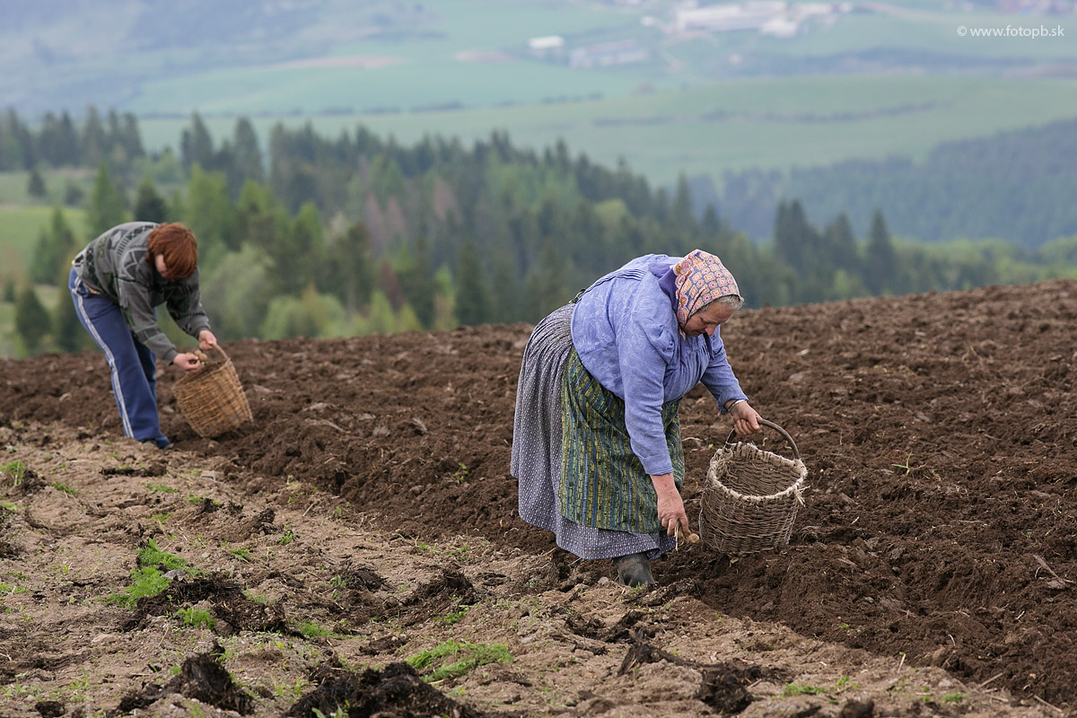 Ručné sadenie zemiakov. Tie tradičné košíky na zemiaky sú perfektné a oveľa fotogenickejšie ako plastové vedrá, ktoré ich pomaly na poliach vytláčajú.