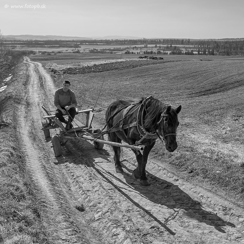 Koník pomaly ťahá voz s gazdom vracajúcim sa po poľnej cestičke do dediny. Vzhľadom na ťažké protisvetlo sa mi fotografia viac pozdáva v tomto čierno-bielom vyhotovení.