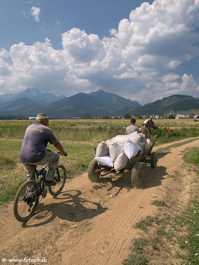 Lendačania sa po žatve vracajú domov z poľa s plnými vrecami obilia.
