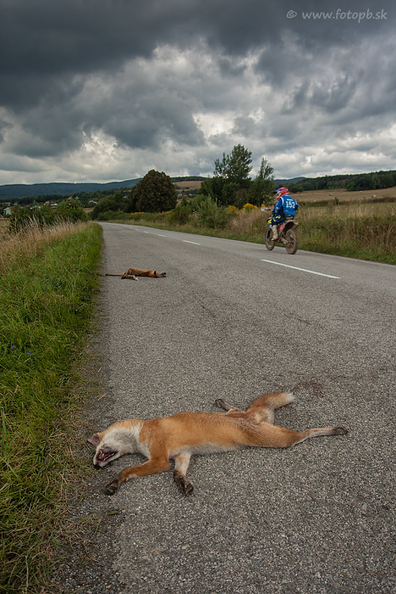 Veľké motocyklové preteky majú aj svoju negatívnu stránku. Hluk v okolitých lesoch a zvýšená premávka pôsobia stresujúco na zver a potom to dopadne takto. Doteraz som ešte nevidel dve naraz zrazené líšky ako sú na fotografii z okolia Hyľova. A to ešte nebolo všetko, lebo pár desiatok metrov bližšie k dedine ležala ešte jedna malá srnka.