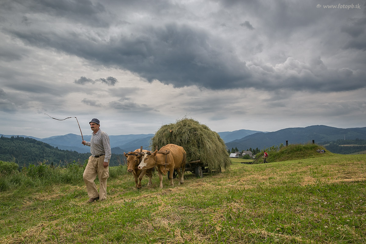 Odvoz sena s pomocou kravského záprahu.