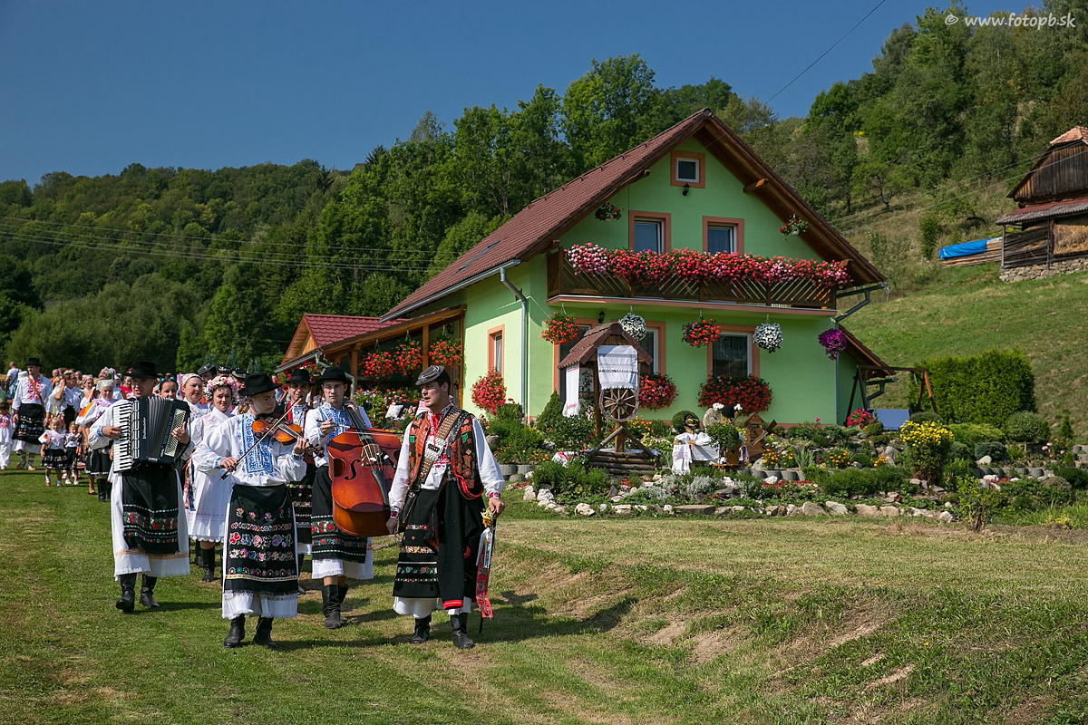 Momentka z predvádzania tradičnej Hriňovskej svadby. Sprievod kráčajúci od domu ženícha k domu nevesty.