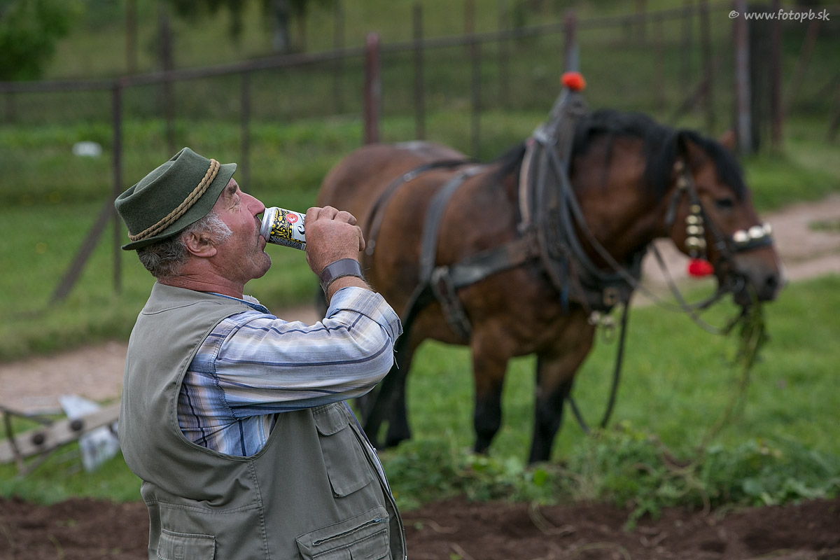 Po náročnej práci na poli si musí gazda aj koník doplniť energiu.