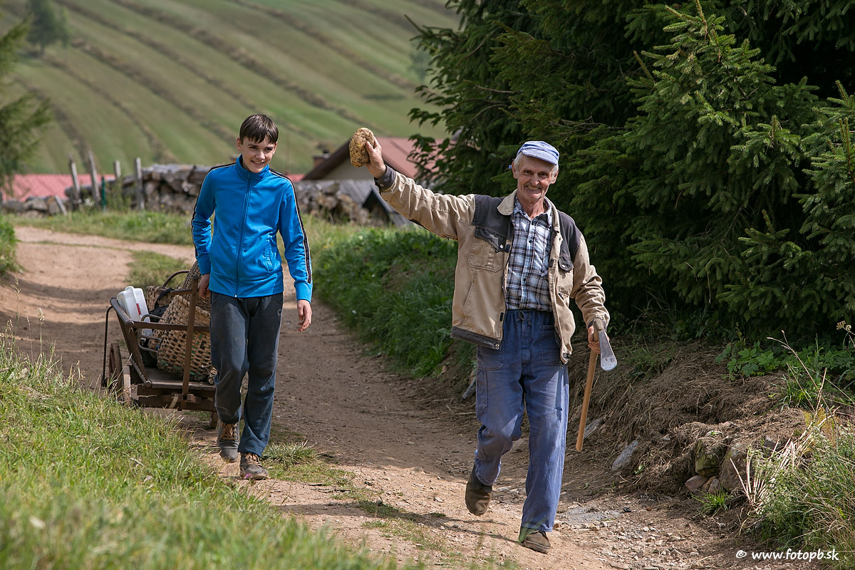 Miestny pestovateľ prejavuje spontánnu radosť z toho aké veľké zemiaky sa mu urodili.